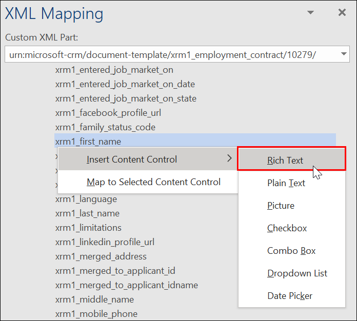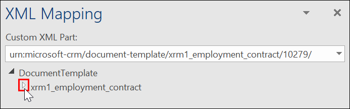 On the right side the XML Mapping area opens. Here, select urn:microsoft-crm/document-template/xrm1_employment_contract/