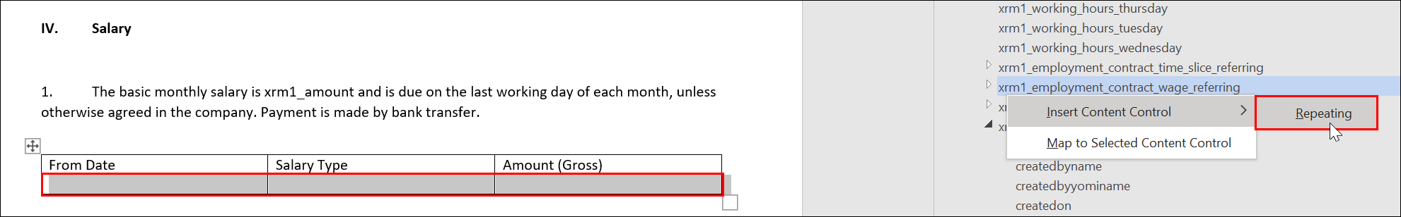 If you have a representation in a table in your employment contract, for example for the salary, this can also be filled with content controls. To do this, select the row to be filled in the table and right-click on the entity in the XML mapping window. In the compensation example, this is "xrm1_employment_contract_wage_referring". Navigate to "Insert Content Control" with the mouse and click Repeating. This will ensure that as many records as there are will be displayed later in the table.