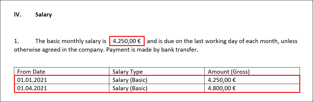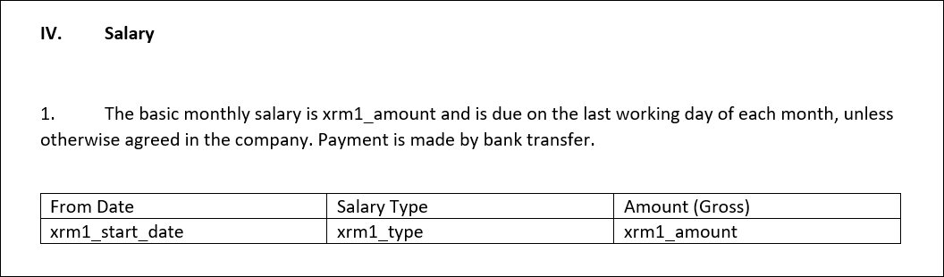 This documentation will guide you through the process of creating a Word employment contract template for your employees. Similar to a series letter, you can create a Word template and pull the predefined data from the system incorporating your current standard contract document.