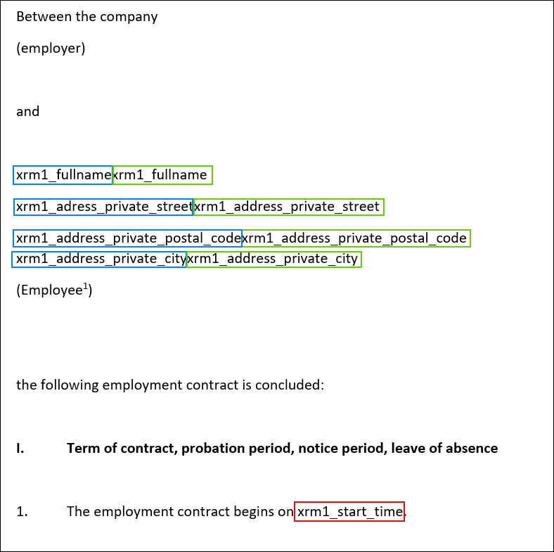 Now, for example, add the applicant's name and address first. You can find the content controls for this under xrm1_applicant_employment_contract_referring. For name and address the following content controls are needed: