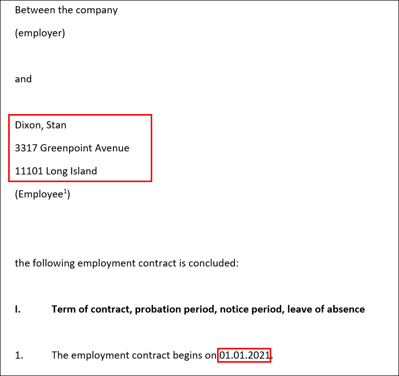 In the following example, the name and address of the (future) employee will be added. If the employee is still defined in the system as an applicant, it makes sense to add the content control for the name and address for both applicant and employee in the Word template.