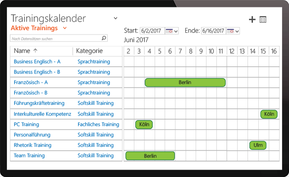 Mit dem Trainingskalender haben Sie einen unternehmensweiten Überblick über alle geplanten Trainings. Filtern Sie nach Kategorien, um sich zum Beispiel nur Sprachtrainings anzeigen zu lassen.