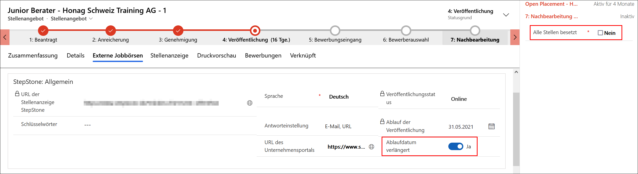 Hierbei können Sie im Prozess einfach wieder zur gewünschten Stufe zurück gehen. Achten Sie jedoch darauf in der 7. Stufe "Nachbearbeitung" das Feld "Alle Stellen besetzt" auf Nein zu setzen. Verlängern Sie außerdem das Ablaufdatum.