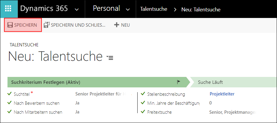 Navigieren Sie zu Navigationsleiste -> Personal -> Talentsuche und klicken Sie auf +NEU