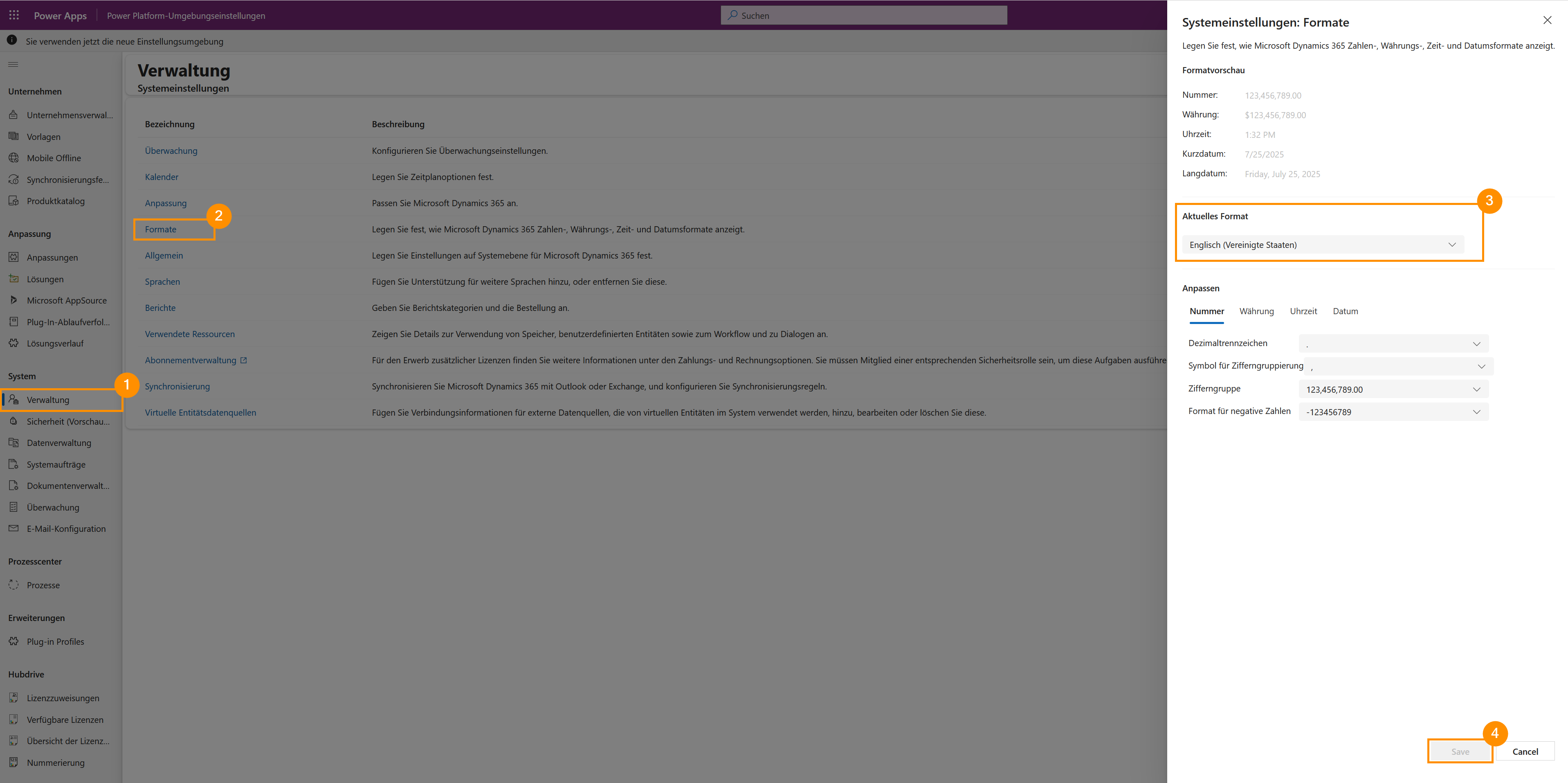 - Unter Aktuelles Format können länderspezifische Anpassungen getroffen werden