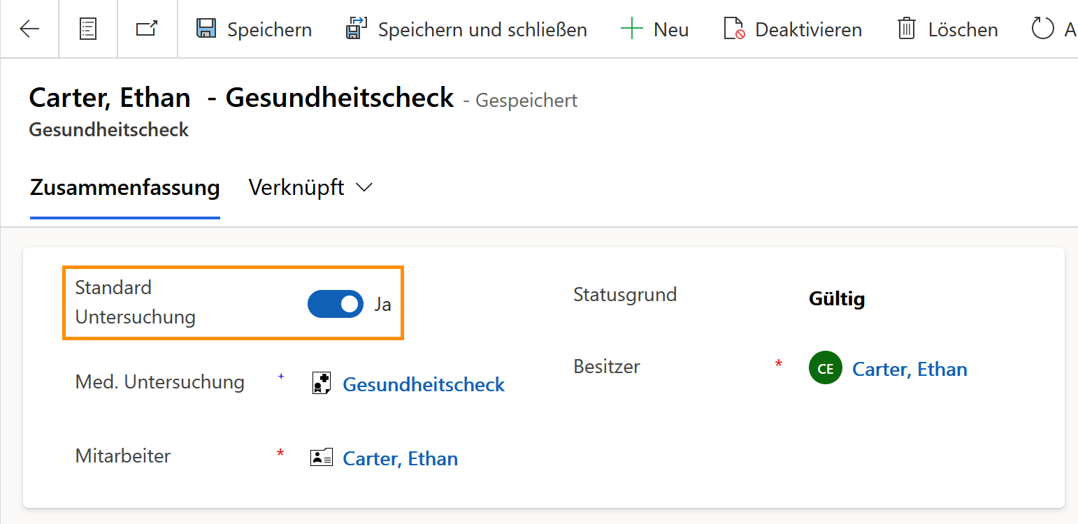 - Die medizinischen Untersuchungen können dem Gesundheitscheck eines Mitarbeiters zugewiesen werden, wenn die Schaltfläche Standard Untersuchung im Gesundheitscheck auf Ja gesetzt ist (Screenshot).