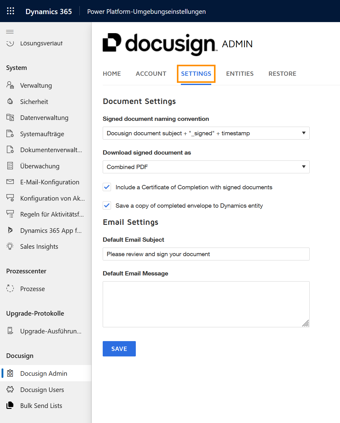 - Falls Sie andere Arten von Dokumenten ebenfalls mit DocuSign direkt aus der Lösung unterzeichnen wollen, stellen Sie die zugehörigen Entitäten ebenfalls auf Enabled