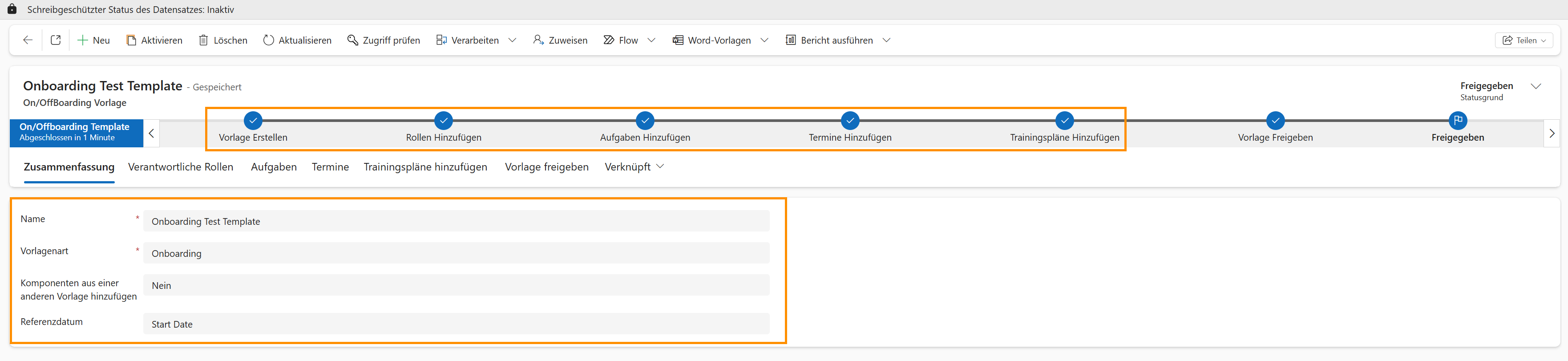 Folgen Sie einfach dem Geschäftsprozessfluss oben im Formular zur Vorlagenerstellung. Er führt Sie Schritt für Schritt durch alle notwendigen Schritte, um Ihre Vorlage mit den erforderlichen Informationen anzureichern – vom Hinzufügen relativer Rollen bis hin zum Hinzufügen von Aufgaben und Terminen.
