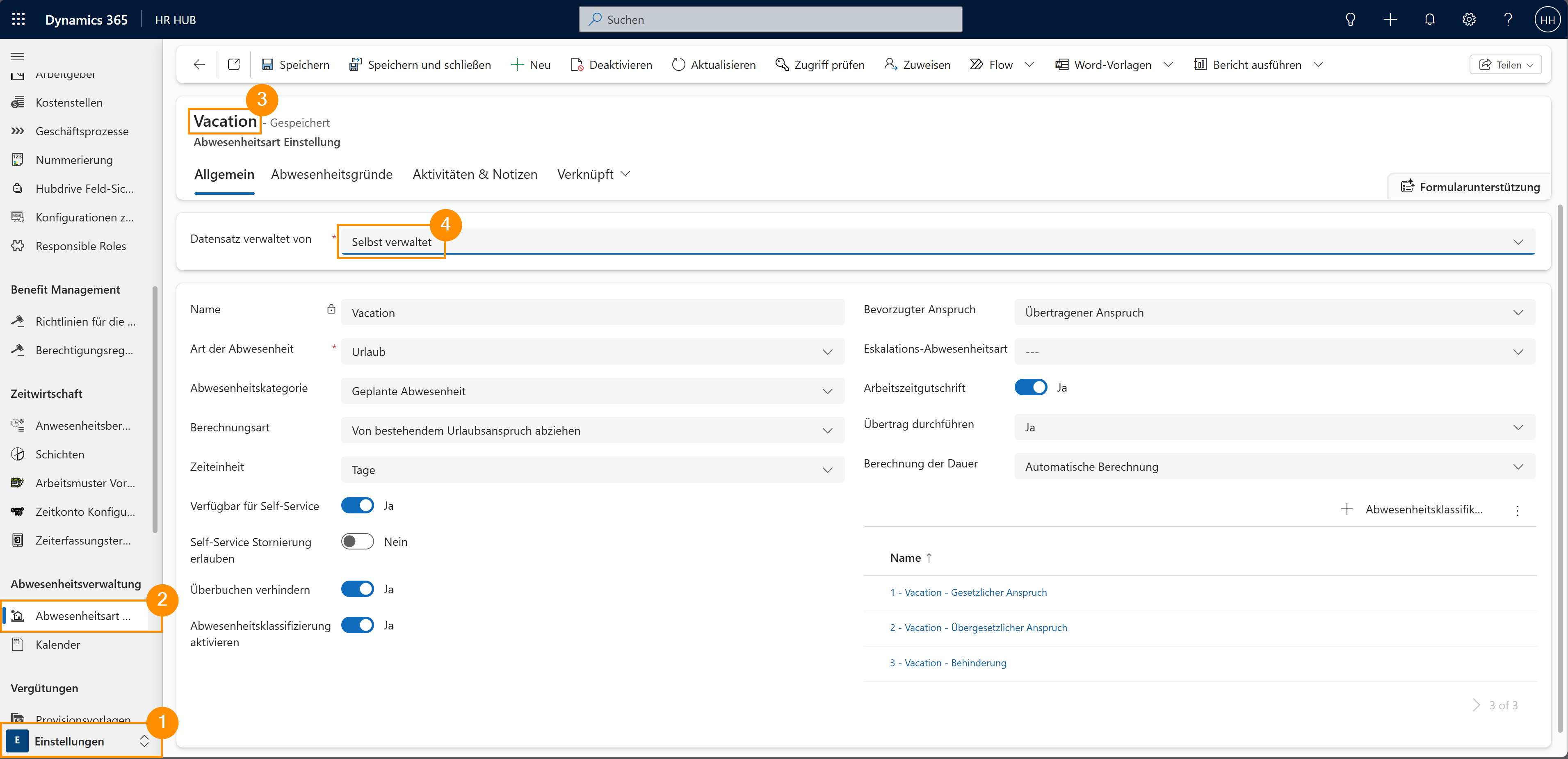Das Setzen der Datensätze auf Selbstgepflegt verhindert, dass Ihre Einstellungen für Abwesenheitsarten durch Systemupdates überschrieben werden.