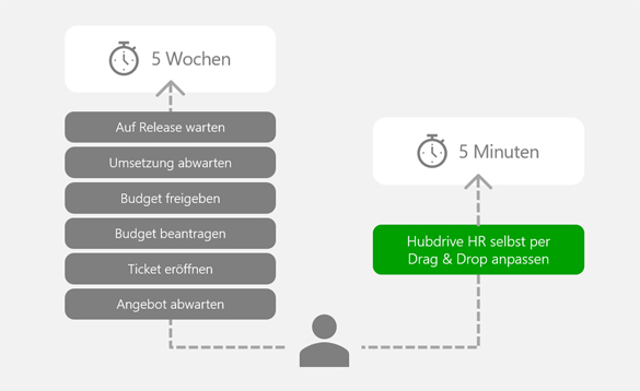 Jede Organisation hat eigene Arbeitsabläufe und muss sich regelmäßig auf veränderte Marktbedingungen einstellen. Mit Hubdrive HR können Kunden ihre Lösung per Drag & Drop immer wieder selbst anpassen und erweitern. Prozessverbesserungen sind deshalb in der Praxis innerhalb weniger Tage umgesetzt.