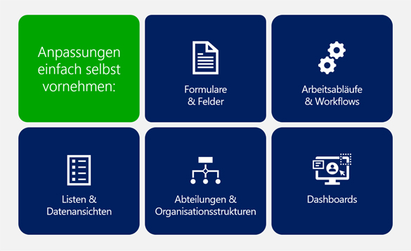 - Felder, Formulare, Listen, Workflows und Genehmigungsprozesse lassen sich per Low‑Code (Power Apps, Power Automate) anpassen, oft per Drag & Drop, ohne Programmierung.