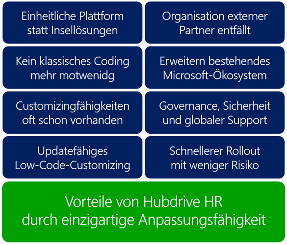 Der technische Mehrwert von Hubdrive HR für die IT bei Anpassungen liegt darin, dass das Customizing schnell, sicher und ohne klassische Entwicklung direkt auf der Microsoft Power Platform erfolgt.