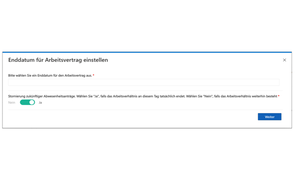 Für diese Möglichkeit wurde im Arbeitsvertrag eine neue Optionsschaltfläche im Dialogformular "Enddatum des Arbeitsvertrages festlegen" hinzugefügt. Mithilfe eines Schalters kann man nun festlegen, ob alle zukünftigen Abwesenheitsanträge storniert werden sollen. Die Logik im Plugin wurde erweitert, die ausgelöst wird, wenn das Beschäftigungsverhältnis aktualisiert wird.