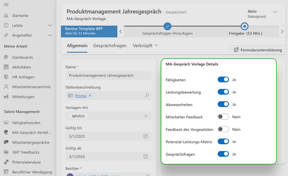 In Mitarbeitergespräche können jetzt Fragenkataloge eingebunden werden. Für jede Stellenbeschreibung lassen sich Fragenkatalog-Vorlagen für die unterschiedlichen Gesprächsarten erstellen. Die Antworten können anschließend sowohl qualitativ als auch quantitativ ausgewertet werden.