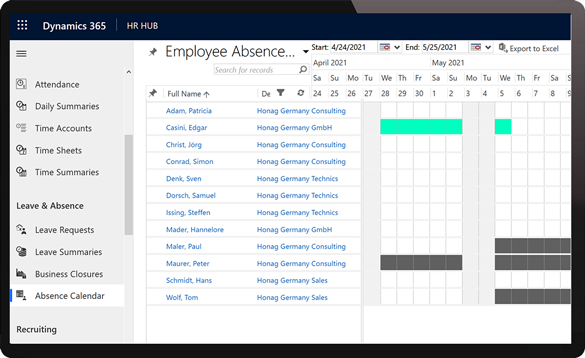With the PSA integration, data from HR for Dynamics can easily be synchronized with PSA. All employee-related information in your HR solution can thus also be used in PSA. Every employee that is created in HR for Dynamics can also be made a bookable resource in PSA. Also data like the employee's skills or skill levels can be easily transferred this way. For example, if an employee with a certain skill level is needed in a project, you can assign him or her directly in PSA. At the same time, due to the integration, it will also be visible in PSA if an employee is absent - for example, because there is an approved leave request.