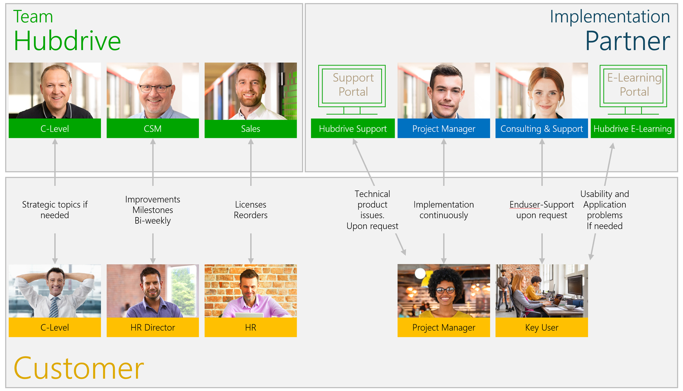The communication matrix defines clear responsibilities and enables efficient collaboration between everyone involved: Hubdrive, Microsoft, implementation partner and customer.